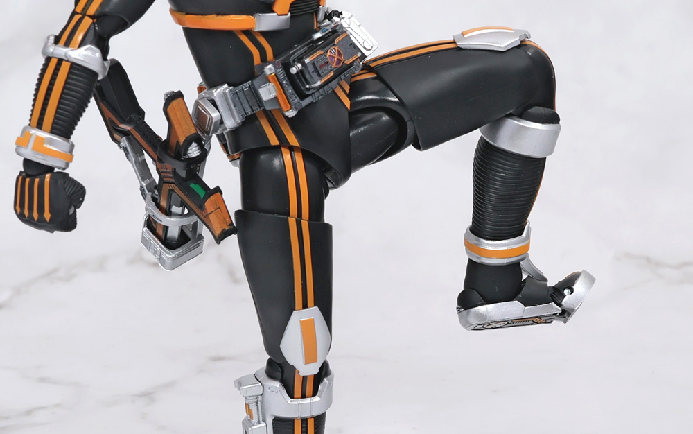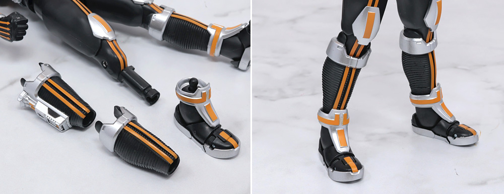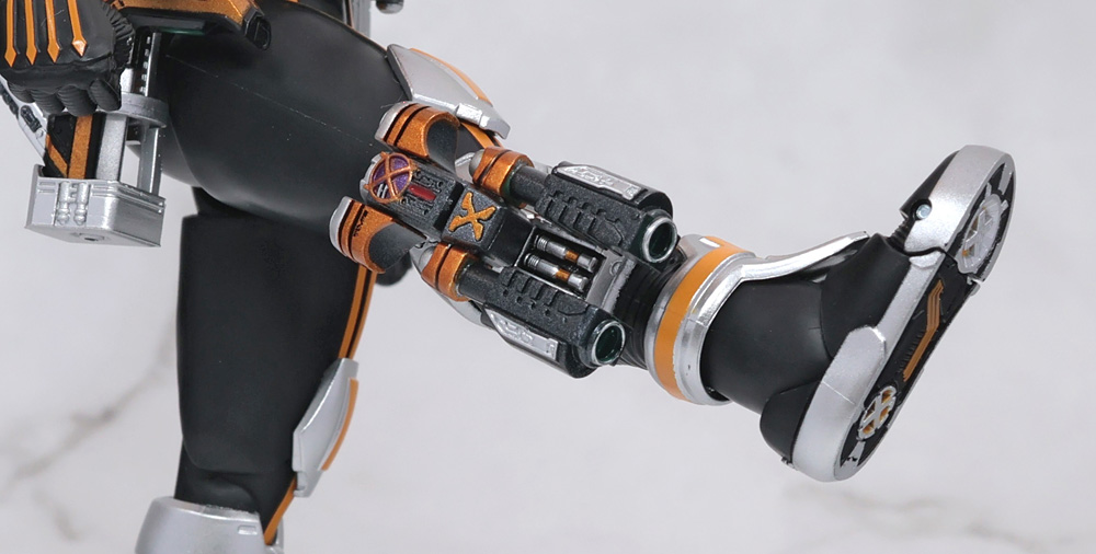 右足に取り付けるキックモードのカイザポインターは腰裏への収納タイプよりも大きめ。