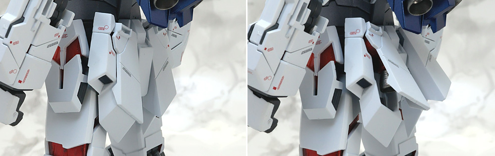 肩アーマー上部のカバーを上げ、側面内部に収納されたスラスターを展開。