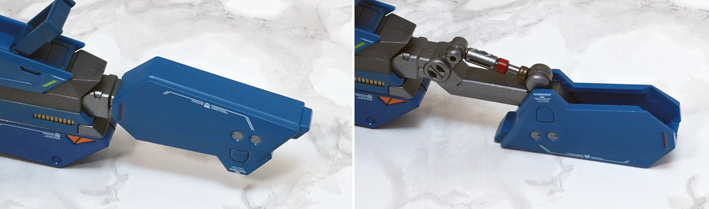 マウントパーツ内部の空間にランチャーを通して、腰フロントアーマー裏にマウントパーツのフックを引っかけて固定。