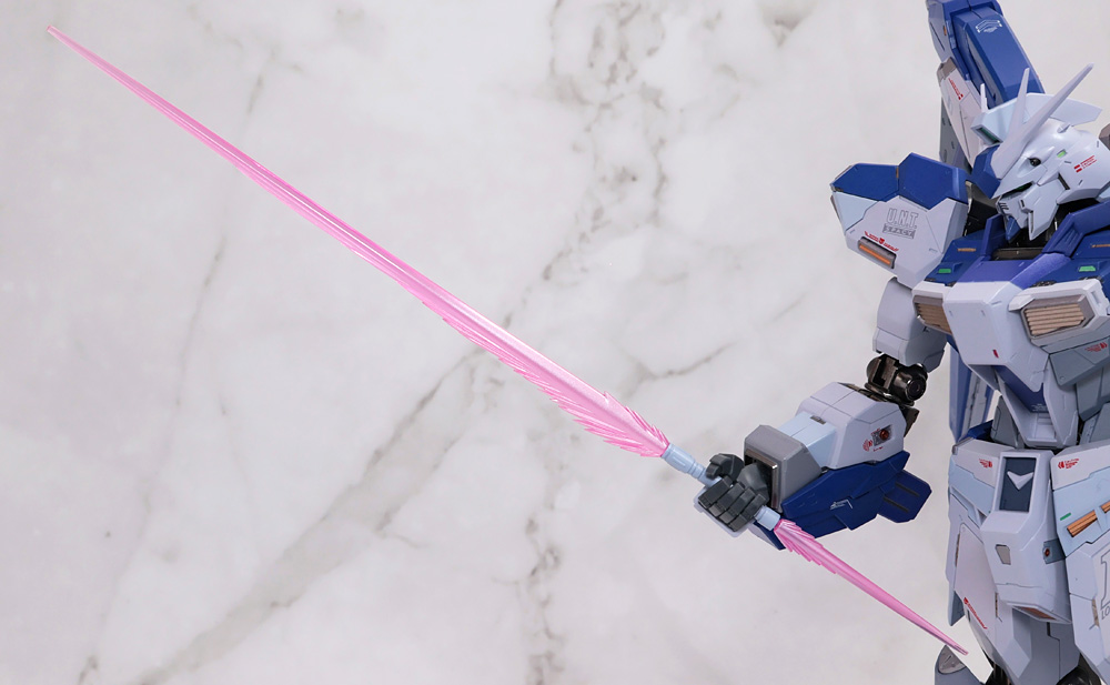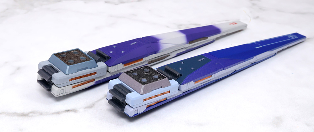 ビーム刃パーツをグリップの前後に装着。ビーム刃パーツは一般販売版よりも濃いめのグラデーション塗装に。