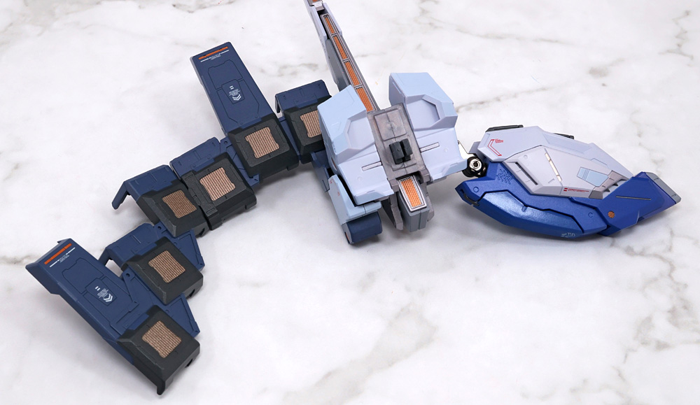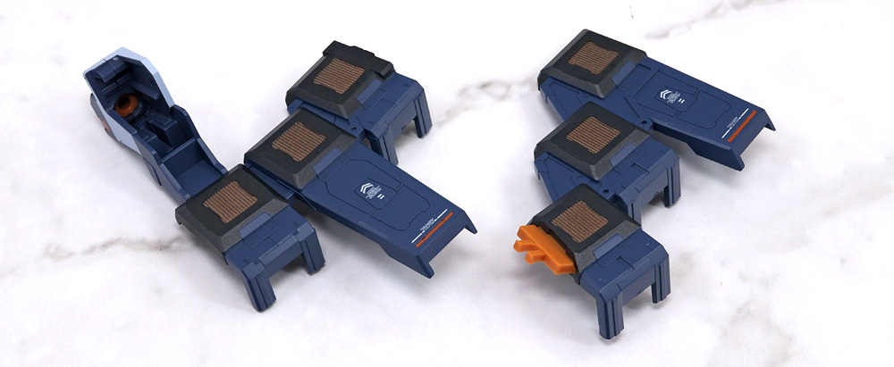 ファンネルコンテナは中間部で分割されて後方に倒すことで内部のスラスターが露出。