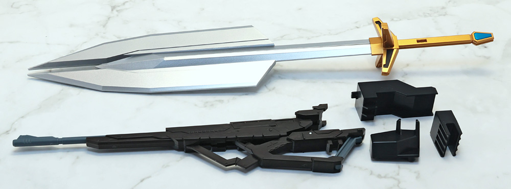 余剰パーツなしの変形合体がウリな商品なので付属パーツは武器と台座部品のみ。