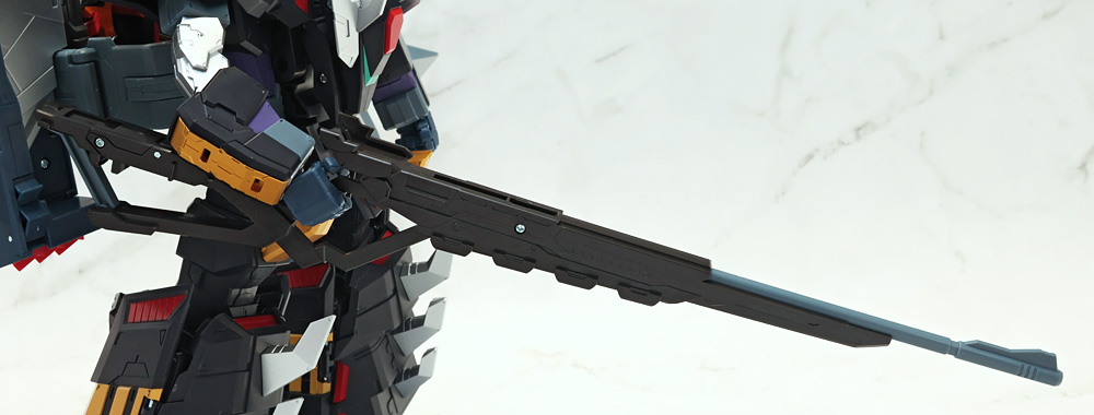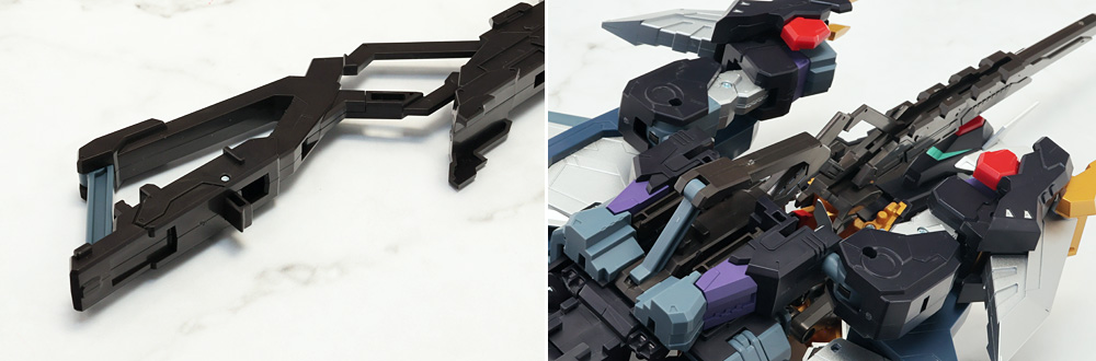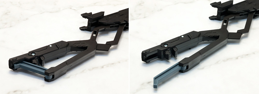 ブラスターライフルはストック先端のパーツを開き、本体股関節から伸びたアームに接続。