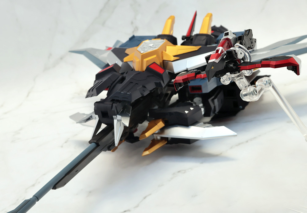 ウイングブロック先端のピンには竜の頭部のブロックを接続してアグレッシブモードの完成。