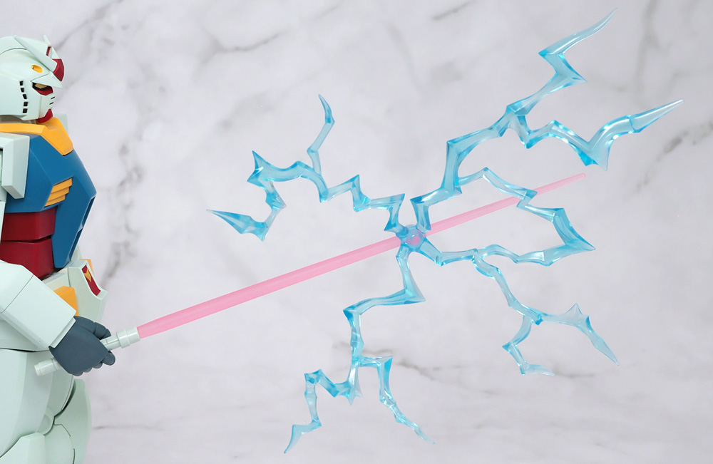 ビームサーベルの鍔迫り合い時のエフェクト効果が造形されたビーム刃パーツも付属。