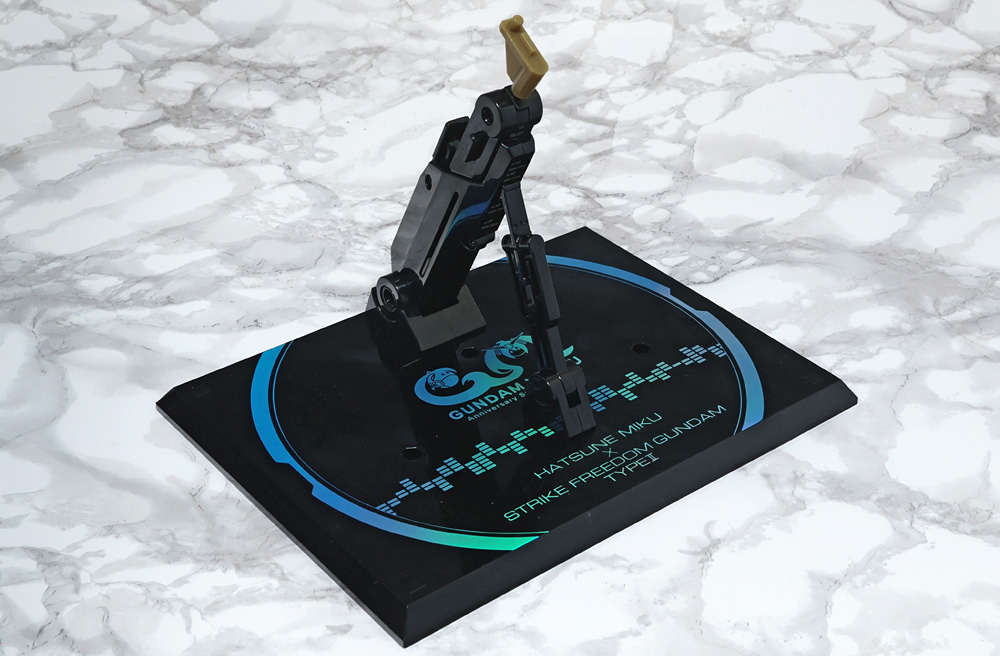 台座。表面には「ガンダム45周年×初音ミク」コラボ企画の箔押しロゴがプリント。