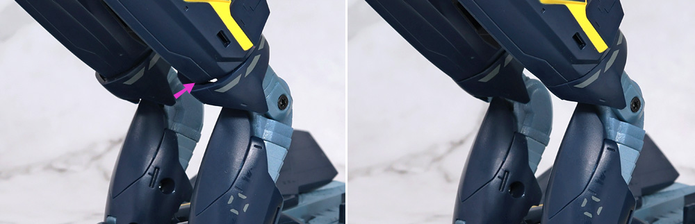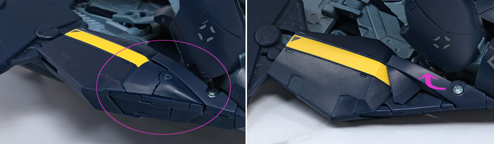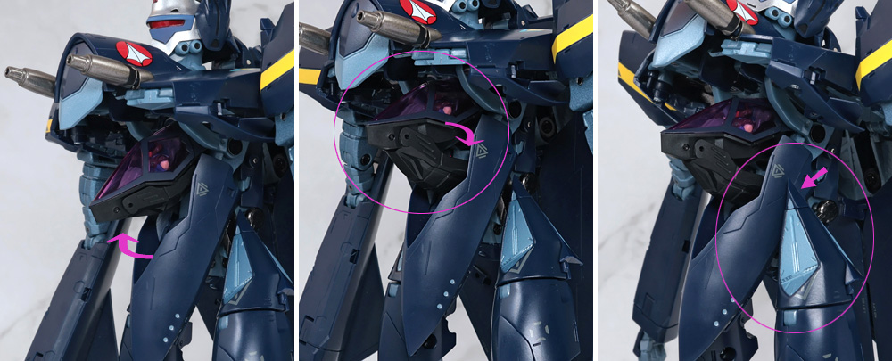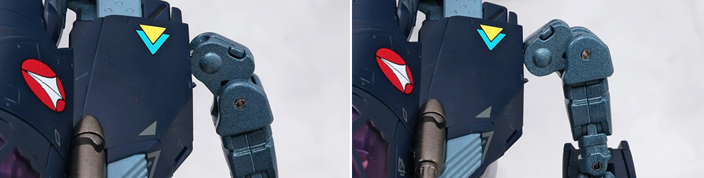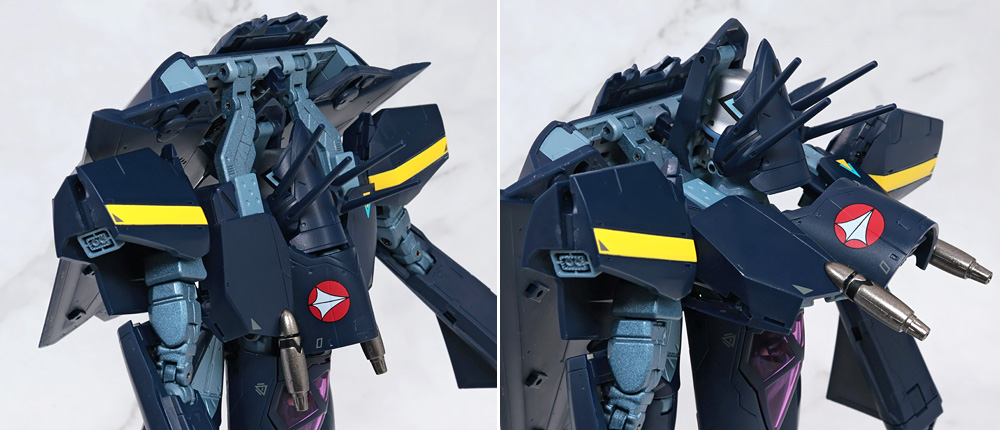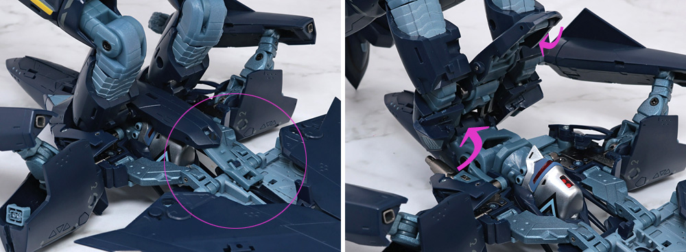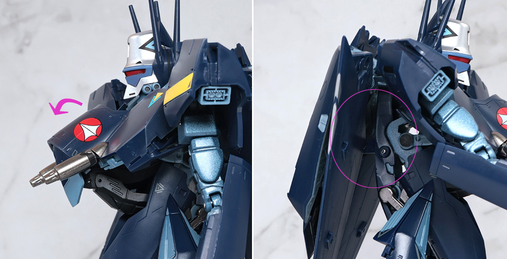 その場合、フトモモ裏に収納した肩アーマー側面のカバーがやや干渉気味になるので注意が必要。