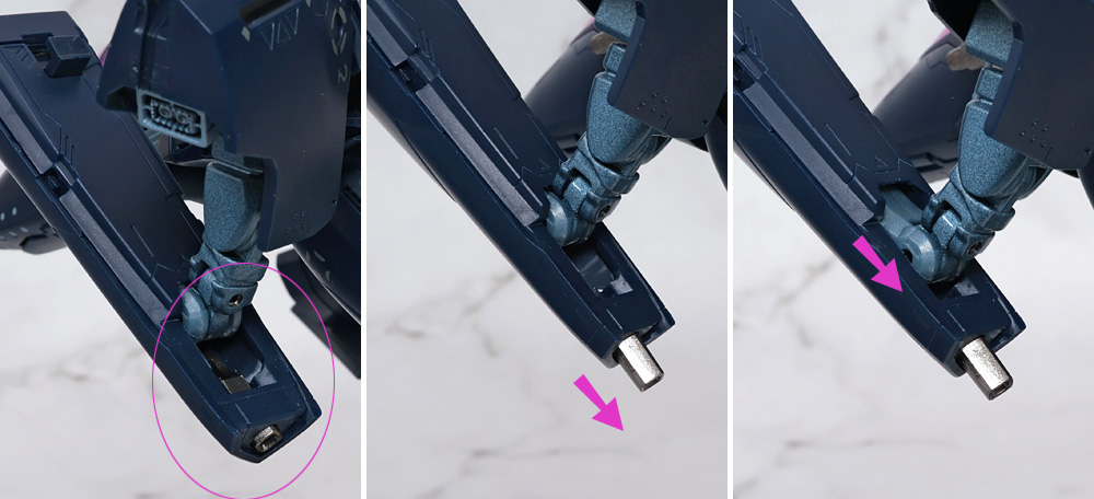ヒジ関節を前側にスライド。連動して内部に収納されたハンドパーツが露出しますがここでは引き出さず。