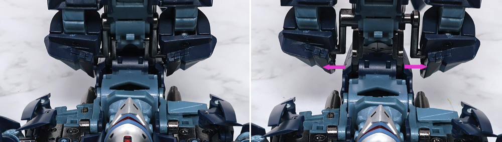 側面の装甲をフトモモ内側にまで収納し、肩アーマーを外側に。