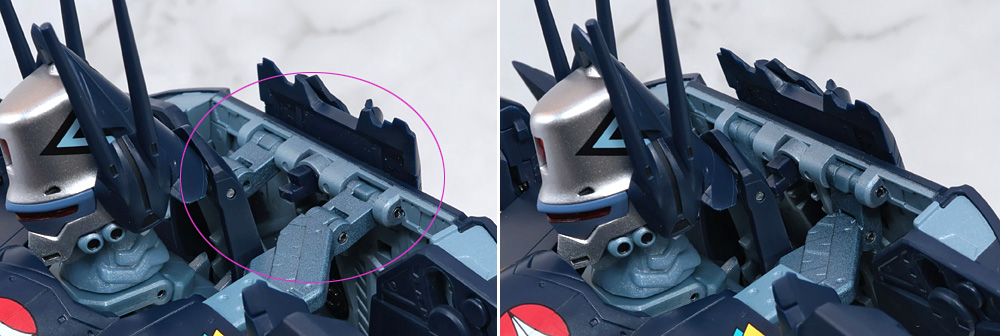 胸部ブロック内部に収納された2枚のコクピットカバーを表に展開。首元にもカバーがあります。